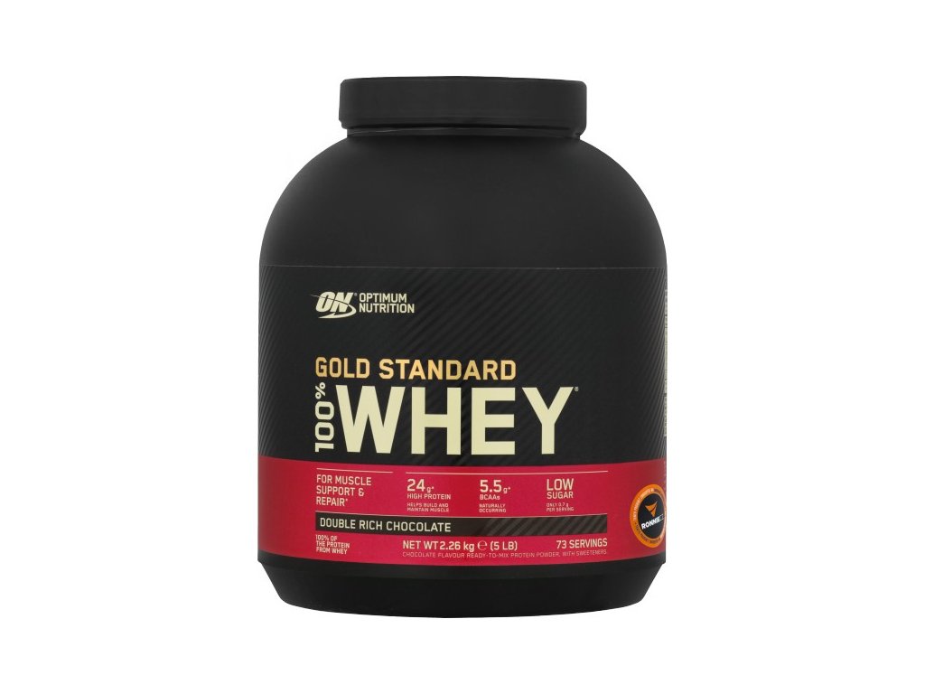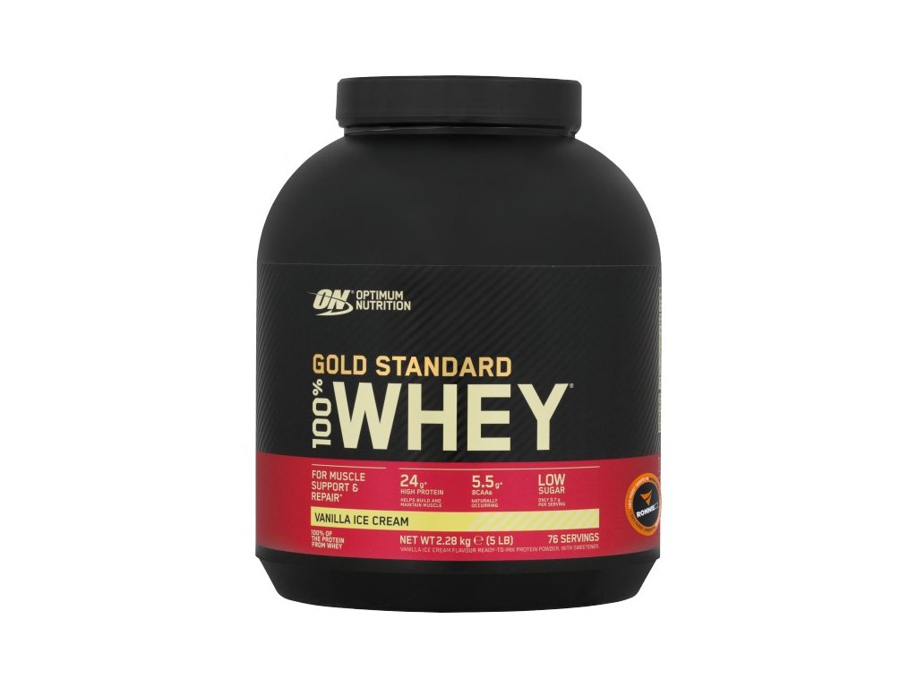 Optimum 100 % Whey Gold Standard je celosvětově nejprodávanější protein, obsahuje ve 100 g dle příchuti 76 - 79 g proteinů nejvyšší kvality. Je tvořen směsí koncentrovaného proteinu syrovátky, čistého extraktu proteinu syrovátky a peptidů syrovátky. Optimum 100 % Whey Gold je díky podstatnému zastoupení bílkovin ideální jak do objemové přípravy s cílem nárůstu svalové hmoty, tak pro udržení svalové hmoty a zabránění jejího odbourávání v dietách. Obsahuje syrovátkový proteinový izolát, syrovátkový proteinový koncentrát a hydrolyzovaný syrovátkový proteinový izolát.