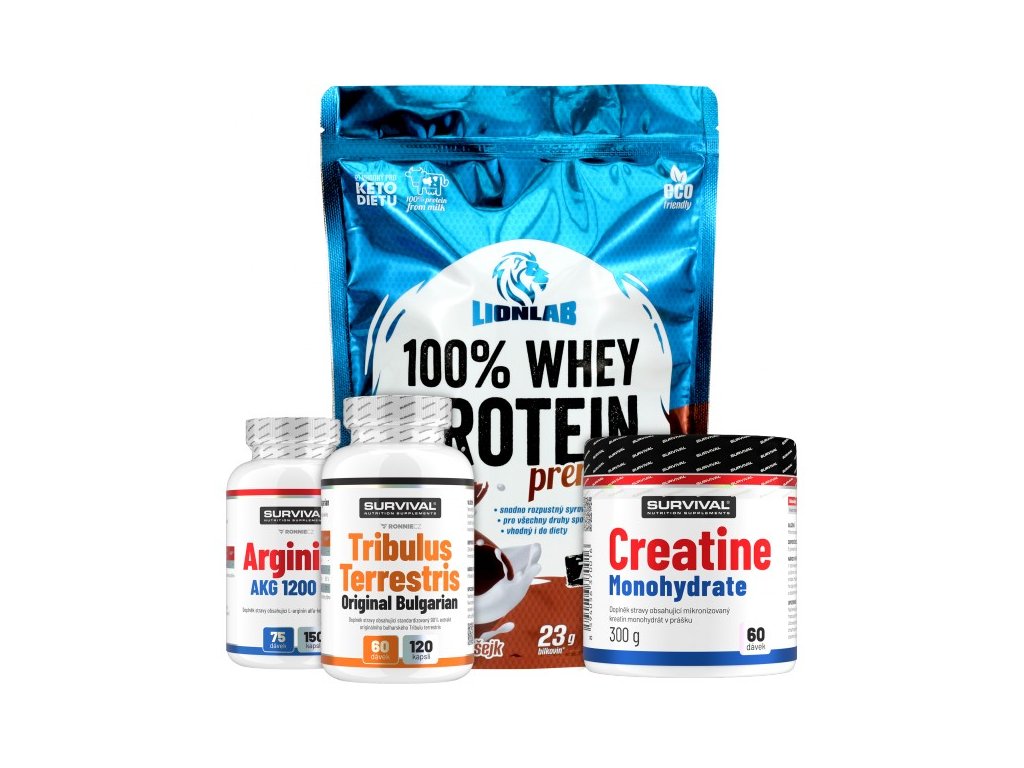 Tento balíček obsahuje všechno, co potřebujete pro podporu nárůstu svalové hmoty, zvýšení výkonu a regenerace a udržení kondice i ve věku nad 40 let. 100 % Whey Protein od Lionlabu můžete používat bezprostředně po tréninku, případně také v průběhu dne jako náhradu některé ze svačin. Tribulus terrestris pak ocení ti, kteří hledají aktivní podporu hladiny klíčových mužských hormonů. Arginin nabídne maximální napumpování svalů, lepší prokrvení a efektivnější transport živin. Kreatin pak podpoří nárůst svalové hmoty a regeneraci. Všechny tyto suplementy teď můžete mít v akčním balíčku, který je cenově výhodný jako nikdy předtím.