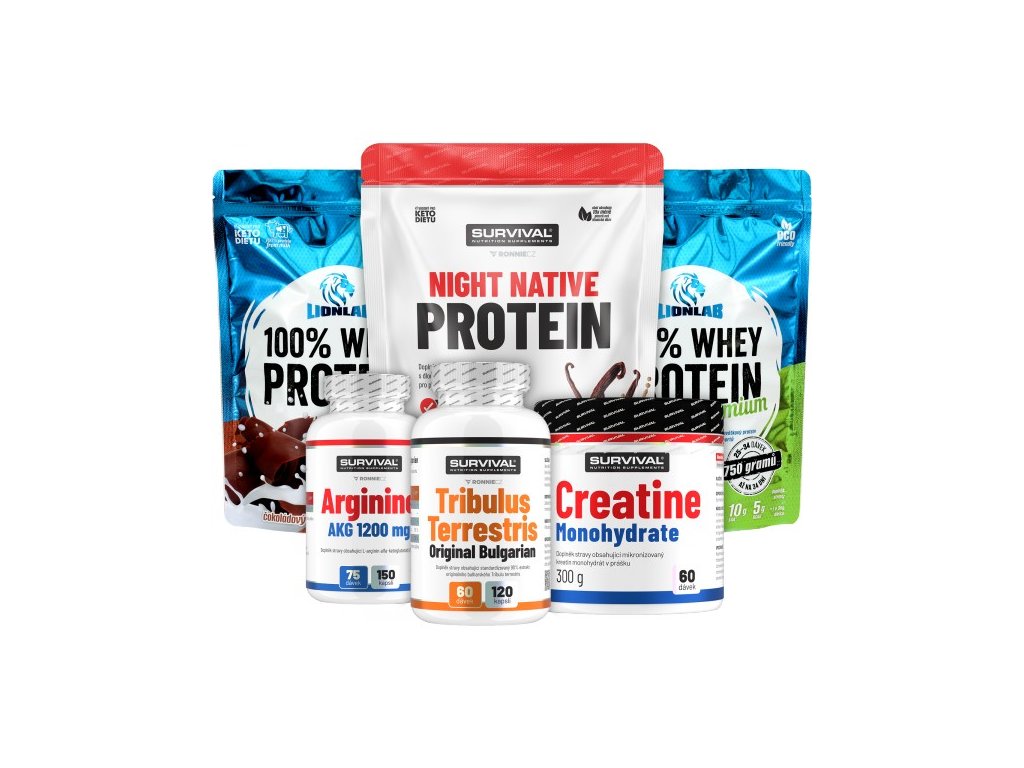Tento balíček obsahuje všechno, co potřebujete pro podporu nárůstu svalové hmoty, zvýšení výkonu a regenerace a udržení kondice i ve věku nad 40 let. 100 % Whey Protein od Lionlabu můžete používat bezprostředně po tréninku, případně také v průběhu dne jako náhradu některé ze svačin. V balíčku najdete hned dvě balení tohoto proteinu, můžete tak zvýšit dávkování bez obav, že by Vám rychle došel. Night Native Protein zařadíte s výhodou večer před spaním, abyste zajistili zásobení těla aminokyselinami v průběhu celé noci. Tribulus terrestris pak ocení ti, kteří hledají aktivní podporu hladiny klíčových mužských hormonů. Arginin nabídne maximální napumpování svalů, lepší prokrvení a efektivnější transport živin. Kreatin pak podpoří nárůst svalové hmoty a regeneraci. Všechny tyto suplementy teď můžete mít v akčním balíčku, který je cenově výhodný jako nikdy předtím.