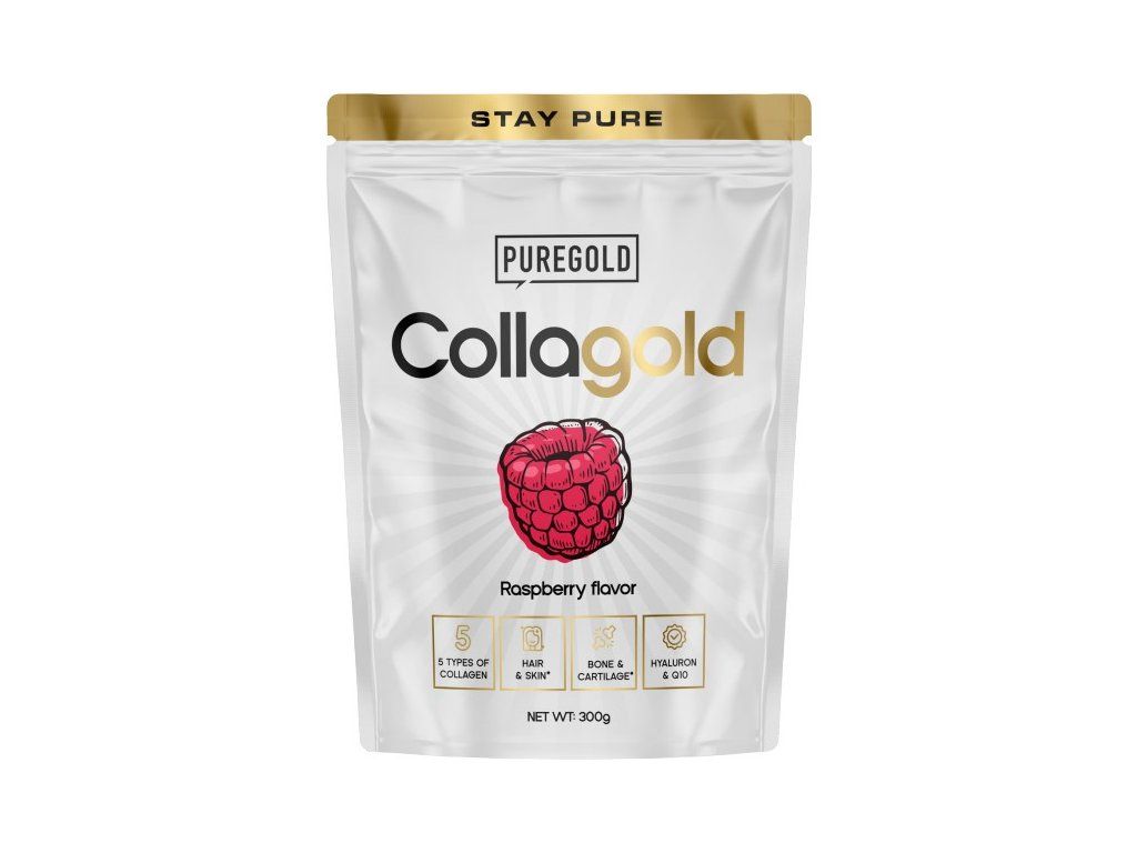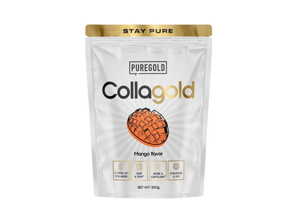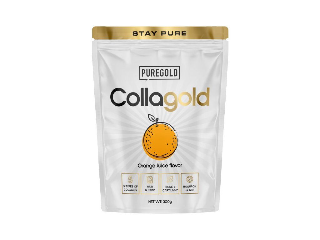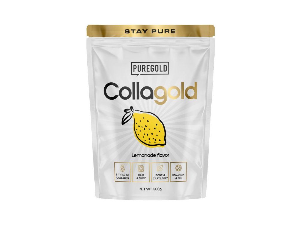 Hydrolyzovaný kolagen s kyselinou hyaluronovou a vitamínem C pro zdravou pleť, pevné vlasy, nehty a podporu kloubů. Pure Gold Collagold je ochucený nápoj obsahující hydrolyzovaný hovězí kolagen a hydrolyzovaný kolagen z mořských ryb, s přídavkem hydrolyzované kuřecí chrupavky, vitamínů, zinku a selenu. Pravidelným užíváním přispívá ke zpomalení stárnutí pokožky, zlepšuje její elasticitu a pomáhá regeneraci pohybového aparátu. Se sladidly.