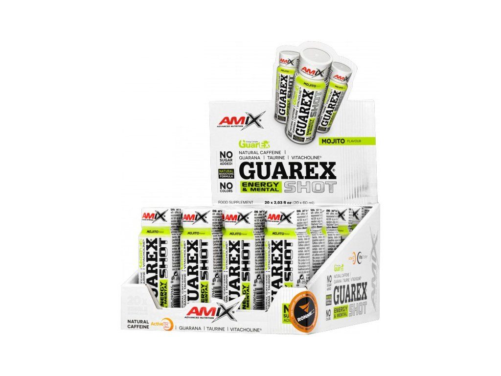 Guarex® Energy & Mental Shot je doplněk stravy v tekuté formě v kapesním balení ampulí. Excelentní dávka energie založená na vysokém obsahu extraktu z guarany, VitaCholine® (cholin bitartrát), taurinu a suroviny ActiveTR™, neboli přírodním enkapsulovaném kofeinu. Díky jednotlivým ampulím si jej můžete snadno vzít kamkoli!