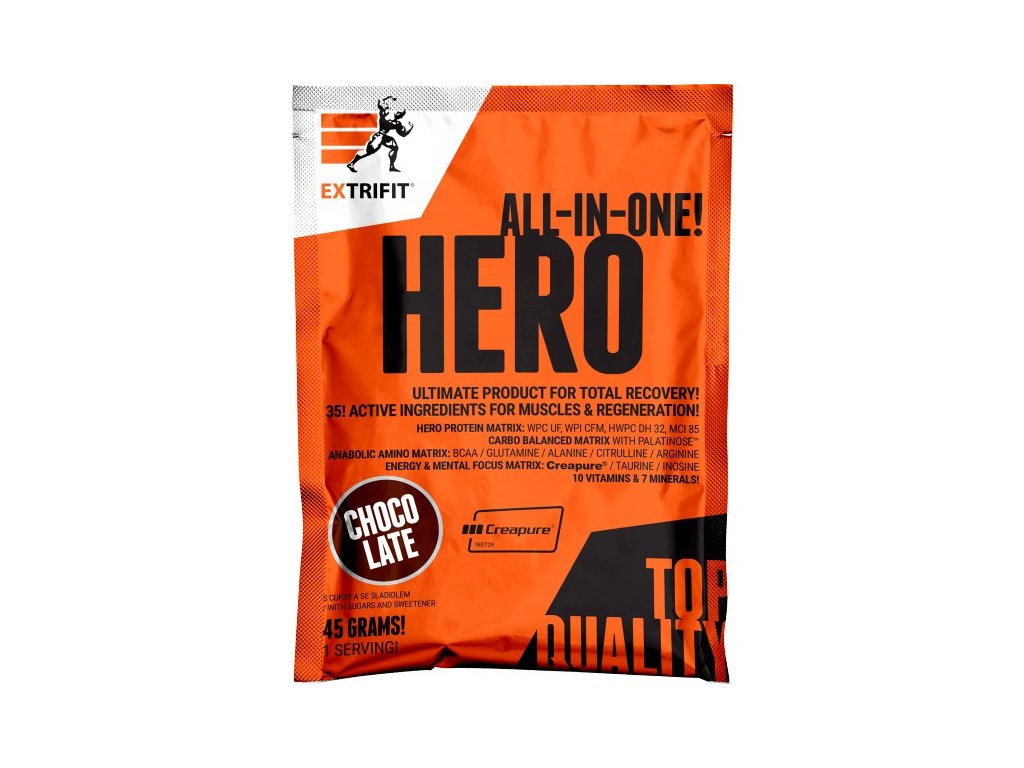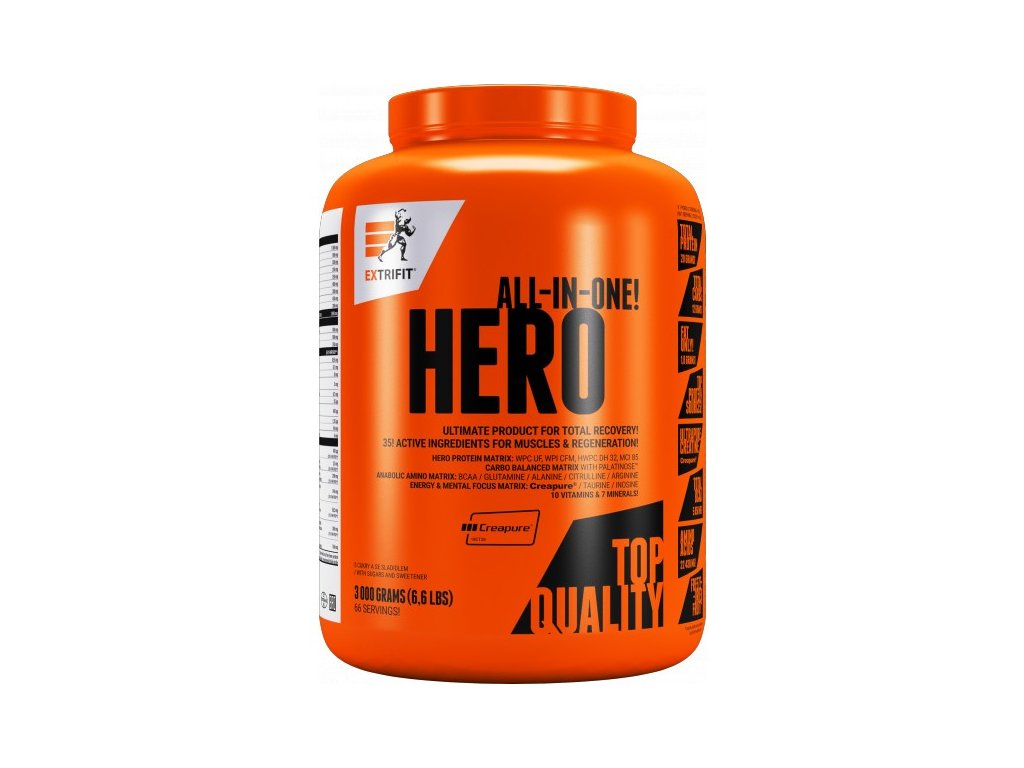 Okamžiky bezprostředně po tréninku jsou nejdůležitější chvílí celého dne, kdy tělo potřebuje velmi rychle stravitelné bílkoviny, kvalitní sacharidy a řadu dalších látek. Řada sportovců tuto potřebu řeší kombinací kvalitního proteinu a gaineru, většina ale sahá po potréninkových suplementech „vše v jednom“. A právě takovým je i Hero, které obsahuje 37 účinných látek! Klíčových je 6 druhů bílkovin (včetně ultra rychlého syrovátkového hydrolyzátu DH32), 4 zdroje sacharidů (s různě rychlým postupným vstřebáváním), matrix 21 aminokyselin, značkový kreatin Creapure, komplex vitamínů a minerálů. Vše, co svaly potřebují po tréninku, aby mohly rychleji regenerovat, růst a sílit. Přečtěte si vše o složení v popisu níže!