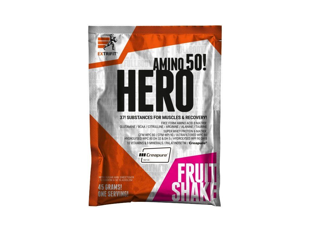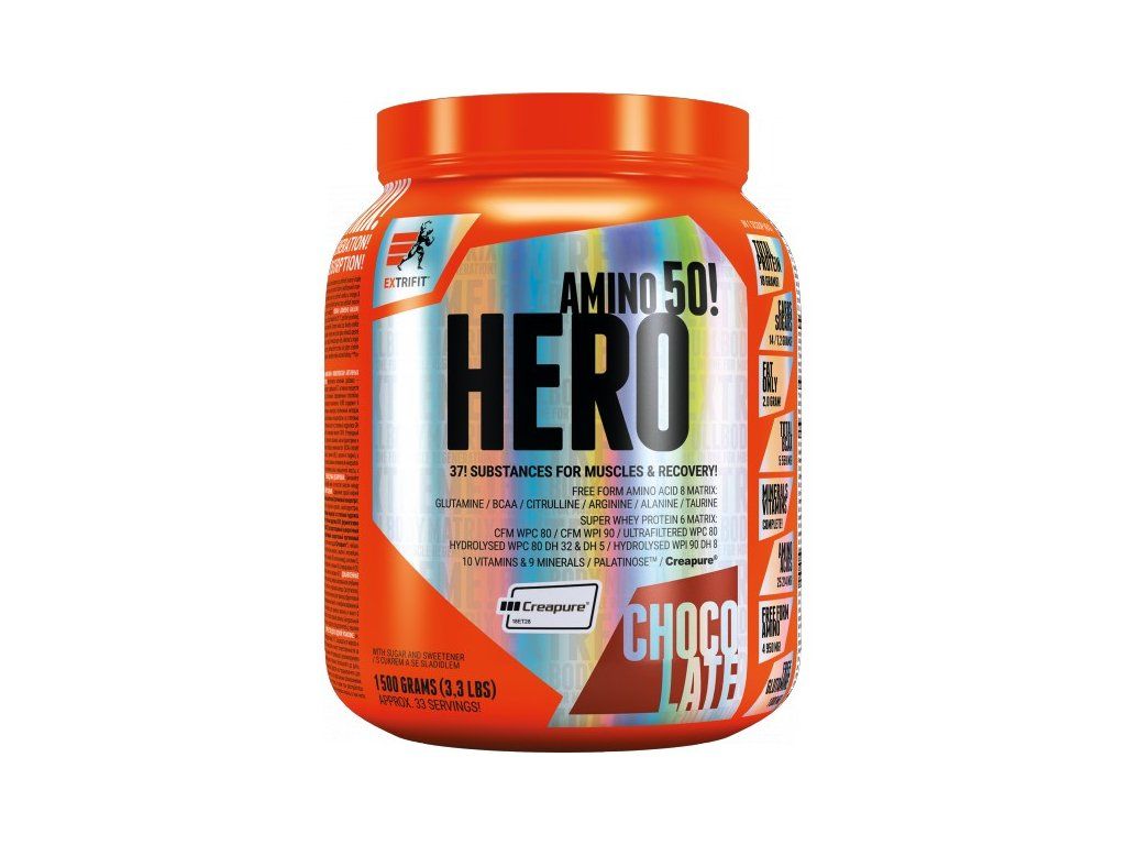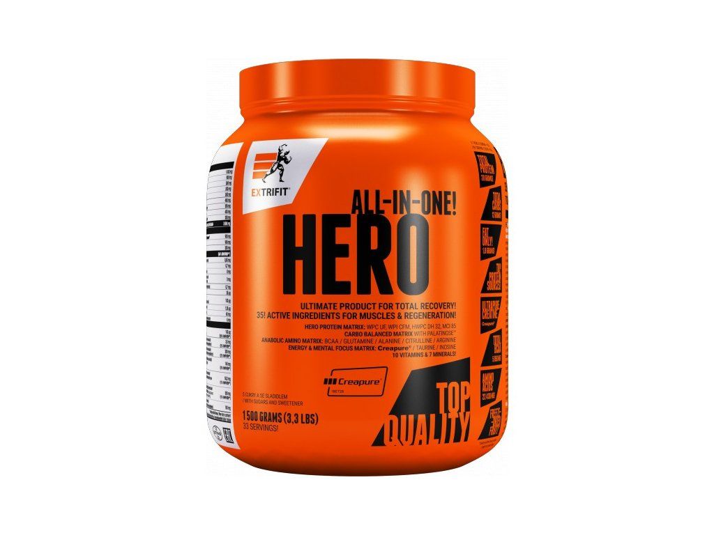 Okamžiky bezprostředně po tréninku jsou nejdůležitější chvílí celého dne, kdy tělo potřebuje velmi rychle stravitelné bílkoviny, kvalitní sacharidy a řadu dalších látek. Řada sportovců tuto potřebu řeší kombinací kvalitního proteinu a gaineru, většina ale sahá po potréninkových suplementech „vše v jednom“. A právě takovým je i Hero, které obsahuje 37 účinných látek! Klíčových je 6 druhů bílkovin (včetně ultra rychlého syrovátkového hydrolyzátu DH32), 4 zdroje sacharidů (s různě rychlým postupným vstřebáváním), matrix 21 aminokyselin, značkový kreatin Creapure, komplex vitamínů a minerálů. Vše, co svaly potřebují po tréninku, aby mohly rychleji regenerovat, růst a sílit. Přečtěte si vše o složení v popisu níže!