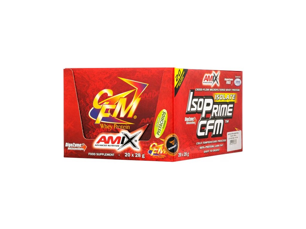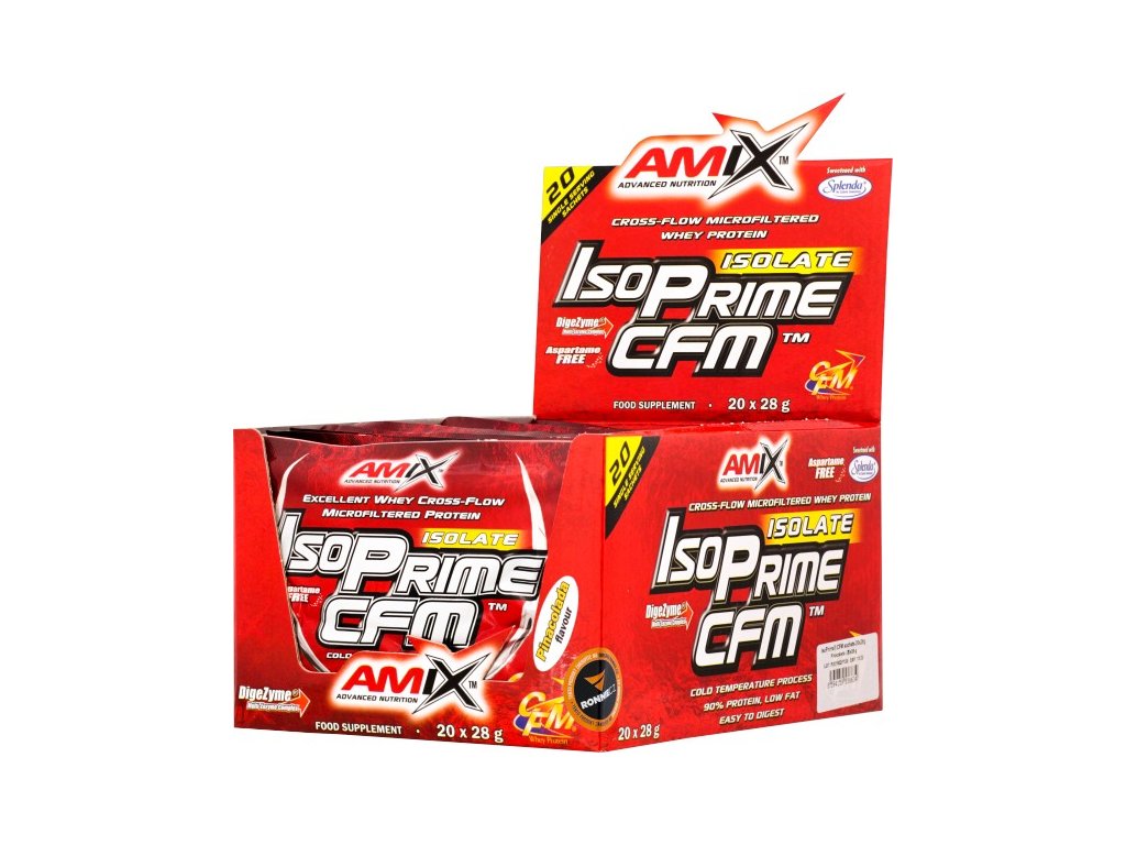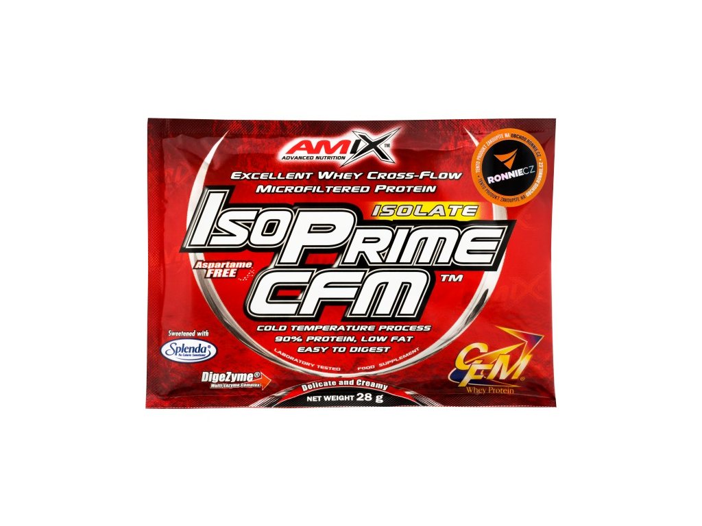 IsoPrime CFM obsahuje 90 % syrovátkového proteinového izolátu vyrobeného metodou CFM (cross-flow microfiltration). Tato metoda zaručuje maximální čistotu. Přináší plné spektrum aminokyselin přirozeně se vyskytujících v syrovátkovém proteinu, včetně vysoké koncentrace BCAA a jiných esenciálních aminokyselin. Obohacen o trávicí enzymy DigeZyme. Neobsahuje aspartam, slazeno značkovou sukralózou Splenda®. Bílkoviny přispívají k růstu a udržení svalové hmoty.