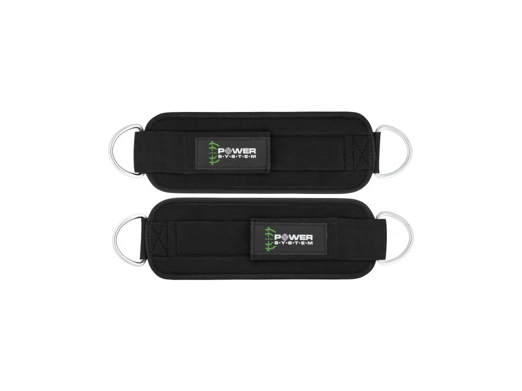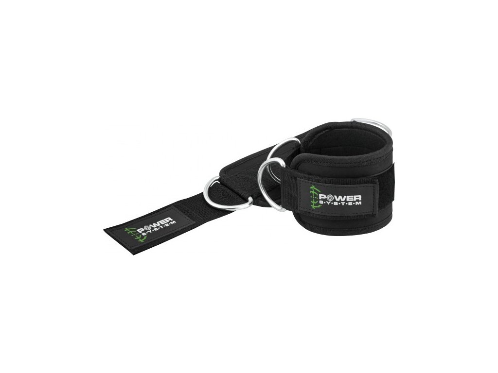 Power System kotníkový adaptér s kovovým očkem k upnutí lanka stroje nebo jiné zátěže. Suchý zip k upevnění kolem kotníků. Rozměry kotníkového adaptéru jsou 28 cm délka a 10 cm šířka.