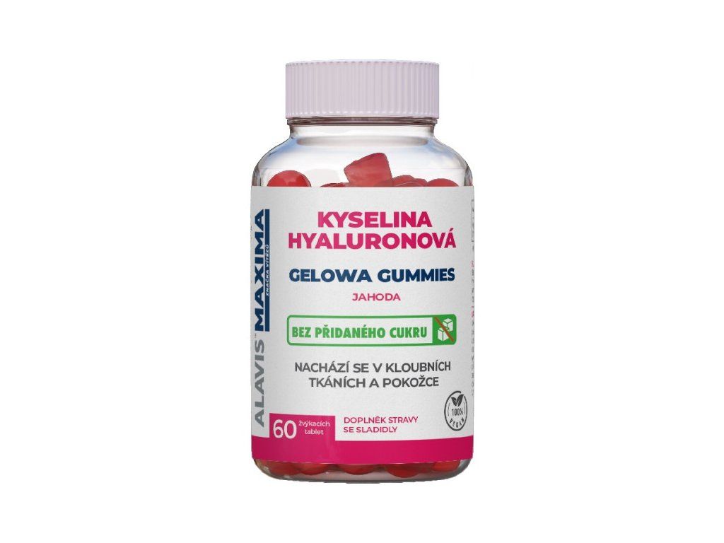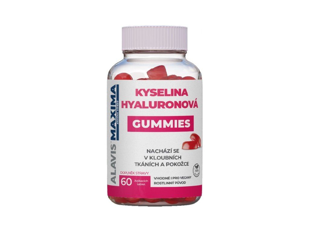 Chutné želatinové bonbony s příchutí lesního ovoce či jahody s vysokým obsahem kyseliny hyaluronové. Působení kyseliny hyaluronové přináší kloubům, chrupavkám i kůži jenom samá pozitiva. Benefitem užívání doplňku stravy ve formě žvýkacích tablet s obsahem kyseliny hyaluronové je vliv na elasticitu pojivových tkání a zdraví kloubů. V neposlední řadě ovlivňuje vlastnosti kloubní tekutiny a hydrataci pojivových tkání kloubních chrupavek a kůže. Současně výrazně snižuje hrubost kůže a hloubku vrásek. Vhodné pro vegany.