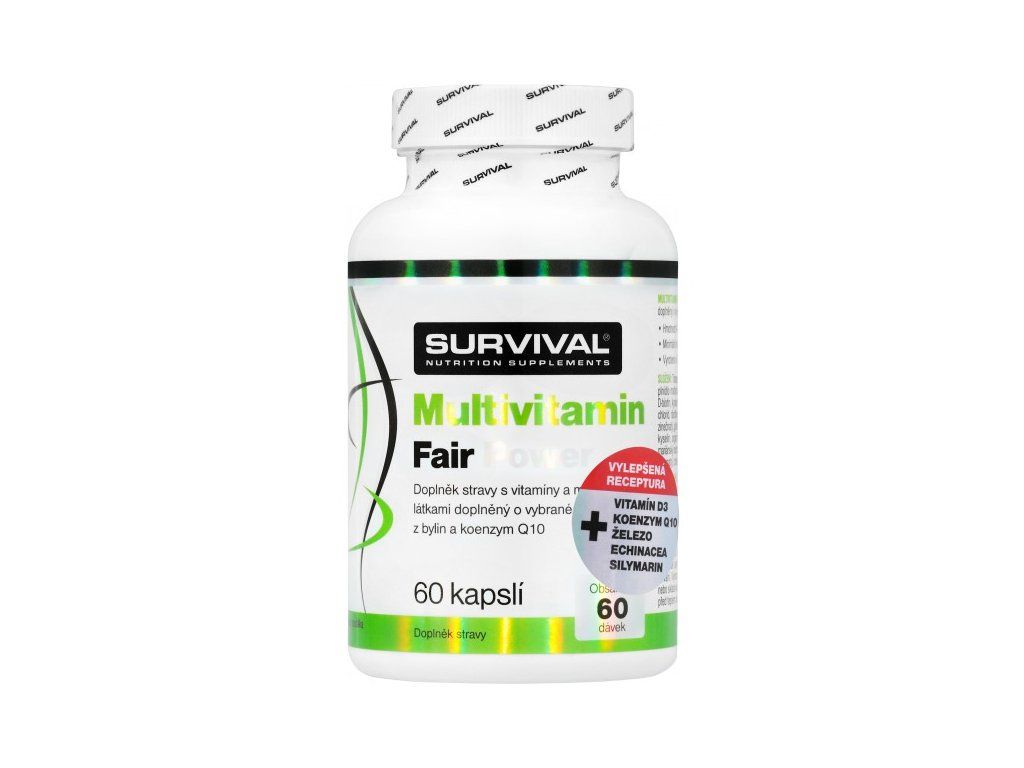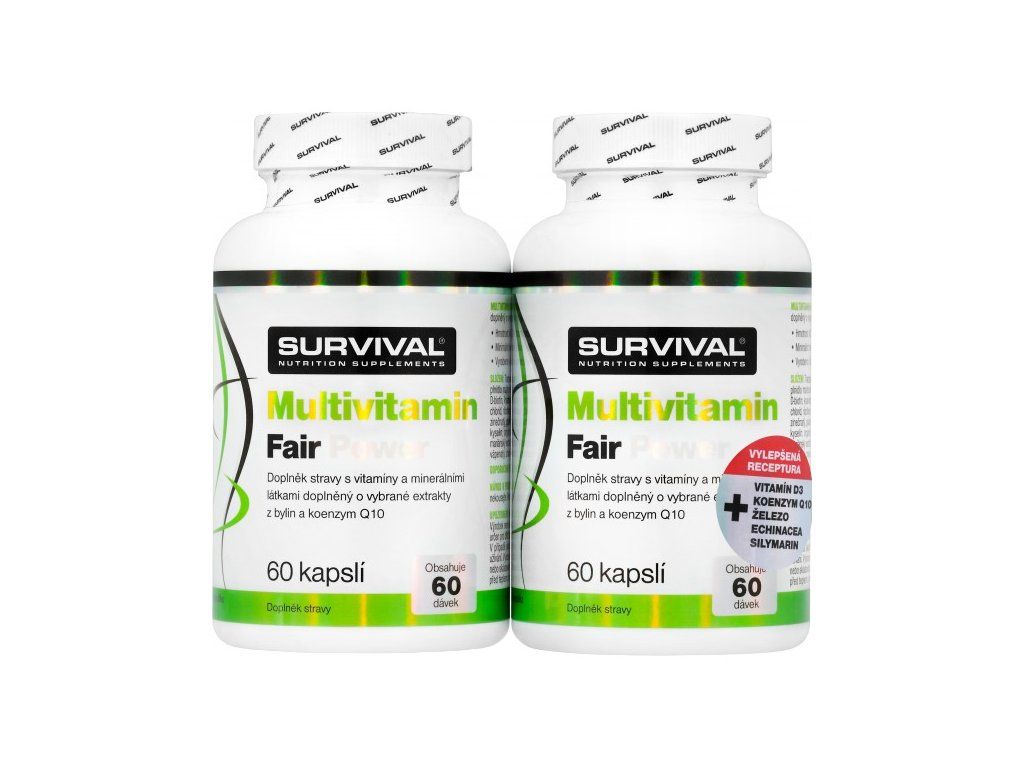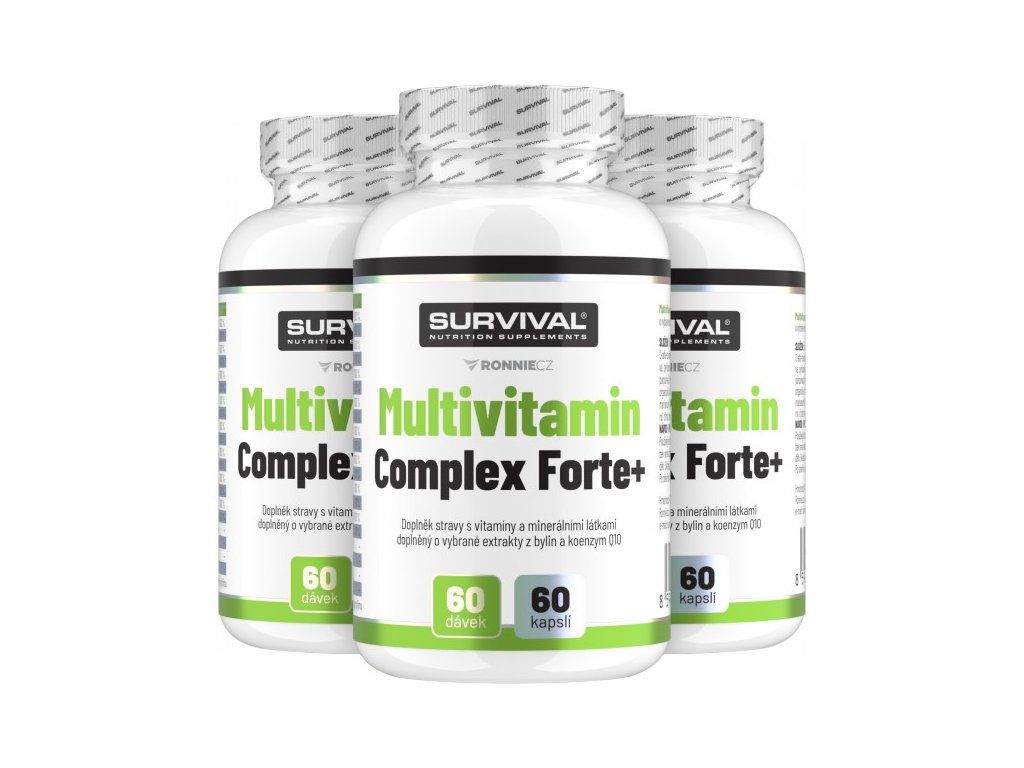V případě, že pravidelně užíváte multivitamínový přípravek, měli byste vědět, že nárazově podané velké množství vitamínů a minerálních látek nedokáže lidský organismus vstřebat a přebytek prostě a jednoduše vyloučí - tzn. užíváte-li doplňky s obsahem megadávek těchto látek, Vaše tělo s velkou pravděpodobností velkou část Vaší (mnohdy finančně nezanedbatelné) investice do zdraví vůbec nevyužije. Proto Survival vytvořil Multivitamin Complex Forte - dokonale vyvážený suplement, který v každé kapsli obsahuje přesně 100 % doporučené denní dávky důležitých vitamínů a vybraných minerálních látek významných (nejen) pro sportovce. Každá kapsle Multivitamin Complex Forte tak umožní dodat Vašemu tělu jednak to, co skutečně potřebuje, a zároveň v dávkách, jaké má šanci reálně využít. Pocítíte-li přesto (např. kvůli náročné práci, nachlazení a podobně) potřebu dávkování zvýšit, i v případě použití více kapslí v různých denních dobách dáte tělu (právě s ohledem na použití v jiný čas) dostatek prostoru přijaté látky využít. Celé využitelnosti také přispívají obsažené minerální látky ve vysoce využitelných chelátových formách!