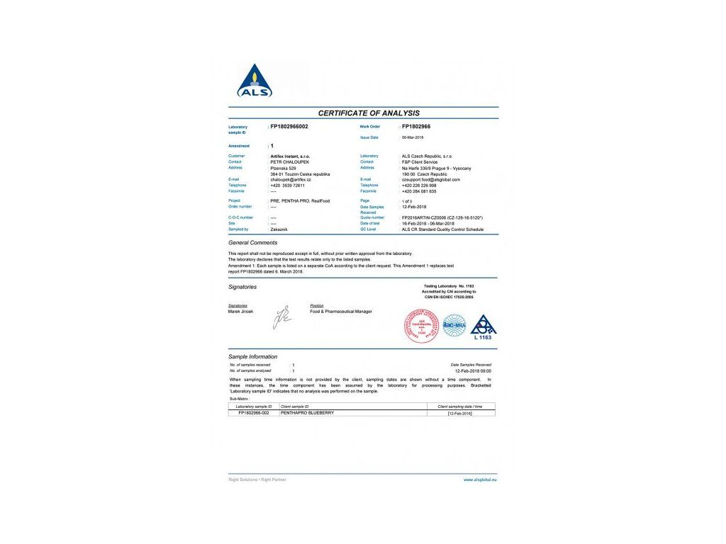 - směs bílkovin Pentha Pro [syrovátkový proteinový koncentrát zpracovaný metodou CFM (mléko, emulgátor sójový lecitin), micelární kasein (mléko), sušený vaječný albumin, syrovátkový proteinový izolát zpracovaný metodou CFM (mléko, emulgátor sójový lecitin), enzymatickou hydrolýzou upravený syrovátkový protein (mléko)], instantní bezlepková ovesná mouka, zahušťovadlo guarová guma, enzymy laktáza, bromelain a papain, sladidlo steviol-glykosidy