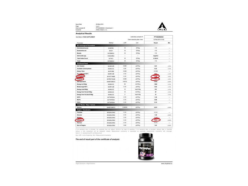 - směs bílkovin Pentha Pro [syrovátkový proteinový koncentrát zpracovaný metodou CFM (mléko, emulgátor sójový lecitin), micelární kasein (mléko), sušený vaječný albumin, enzymatickou hydrolýzou upravený syrovátkový protein (mléko), syrovátkový proteinový izolát zpracovaný metodou CFM (mléko, emulgátor sójový lecitin)], přírodní aroma, enzymy laktáza, bromelain, papain, barvivo koncentrát červené řepy, sladidlo sukralóza
