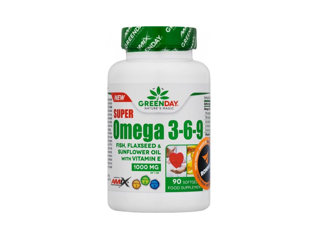 Super Omega 3-6-9 řady GreenDay obsahuje extrakty z rybího, slunečnicového a lněného oleje v měkké želatinové kapsli, které jsou zdrojem nenasycených mastných kyselin. EPA (eikosapentaenová kyselina) a DHA (dokosahexaenová kyselina) přispívají k normální činnosti srdce. Příznivého účinku lze dosáhnout při denním příjmu 250 mg EPA a DHA. ALA (alfa linolenová kyselina) přispívá k udržení normální hladiny cholesterolu v krvi. Příznivého účinku lze dosáhnout s denním příjmem 2 g ALA. Doplněk Super Omega 3-6-9 je obohacen o vitamín E.