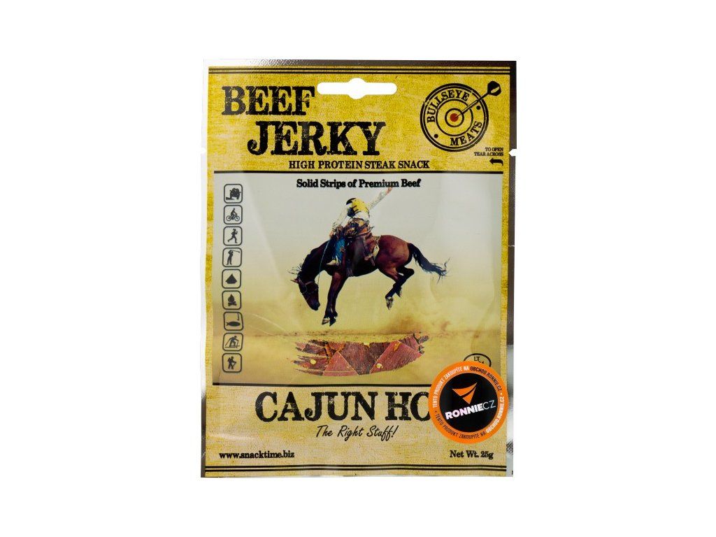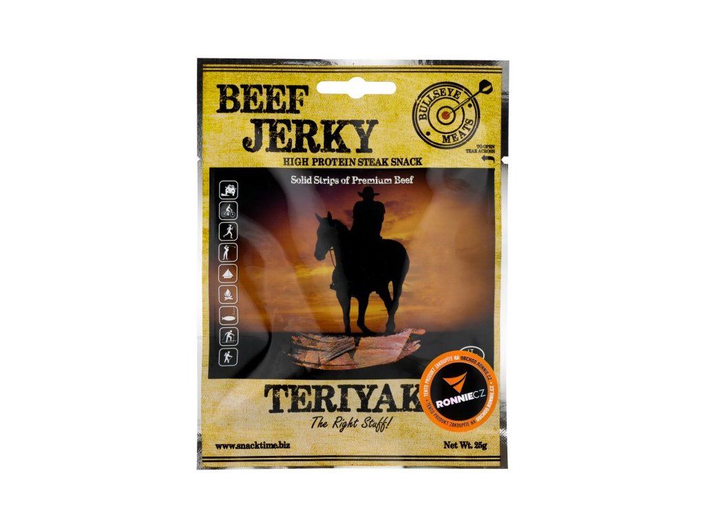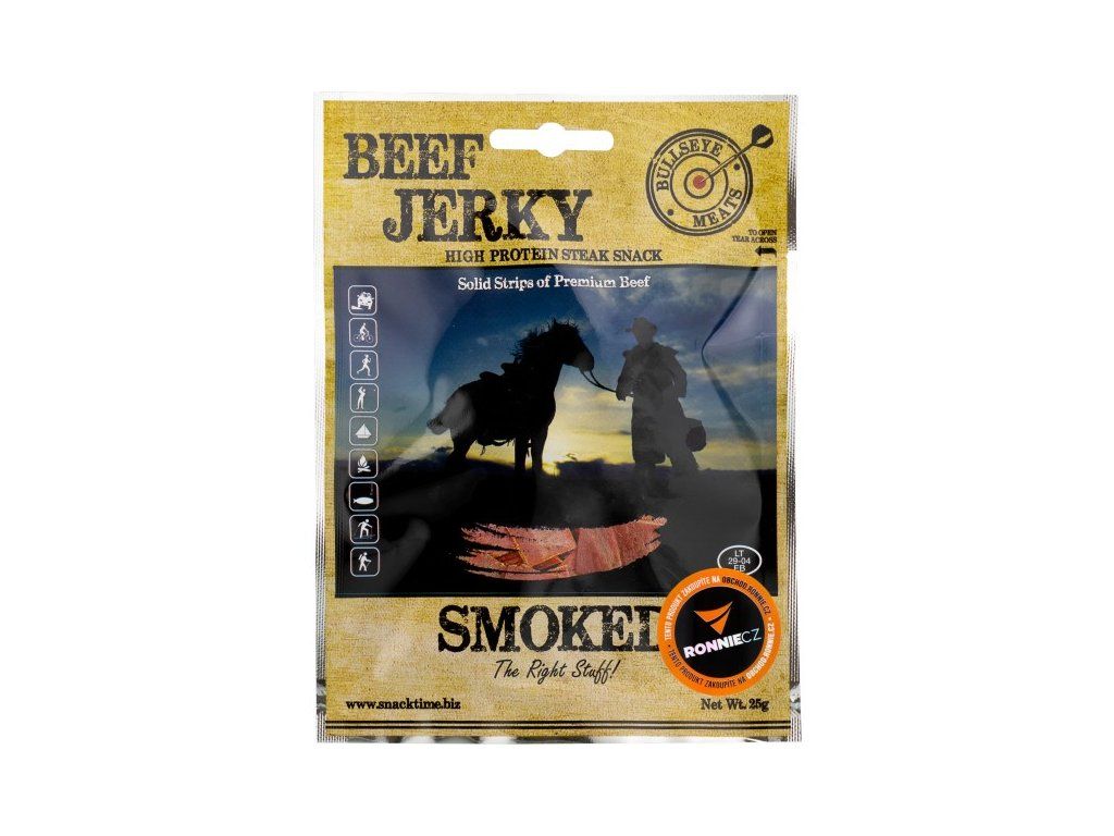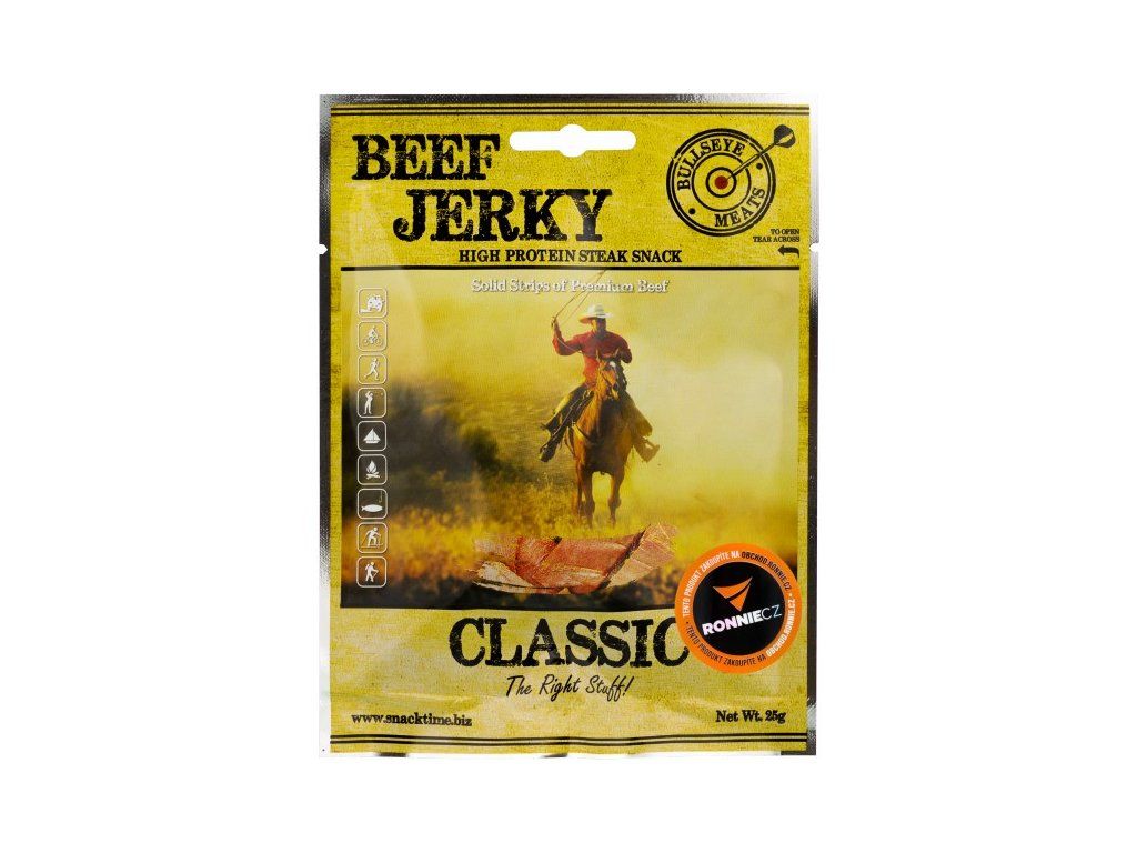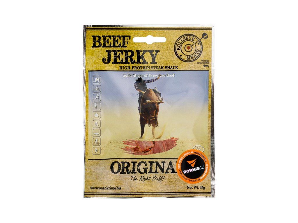 Pevné proužky prémiového hovězího sušeného masa od firmy Snack Time. Svačina s vysokým obsahem bílkovin! Sušené a kořeněné. Lahodná, na proteiny bohatá, bezlepková a nízkotučná pochoutka z plátků prvotřídního hovězího masa. Bullseye Meats Jerky je z 96 % bez tuku, nízkokalorické a je mnohem zdravější než například klasické chipsy. 100 g Jerky představuje 280 g čerstvého masa servírovaného třeba v restauraci - takto ho ale můžete mít vždy u sebe a kdykoliv chcete!