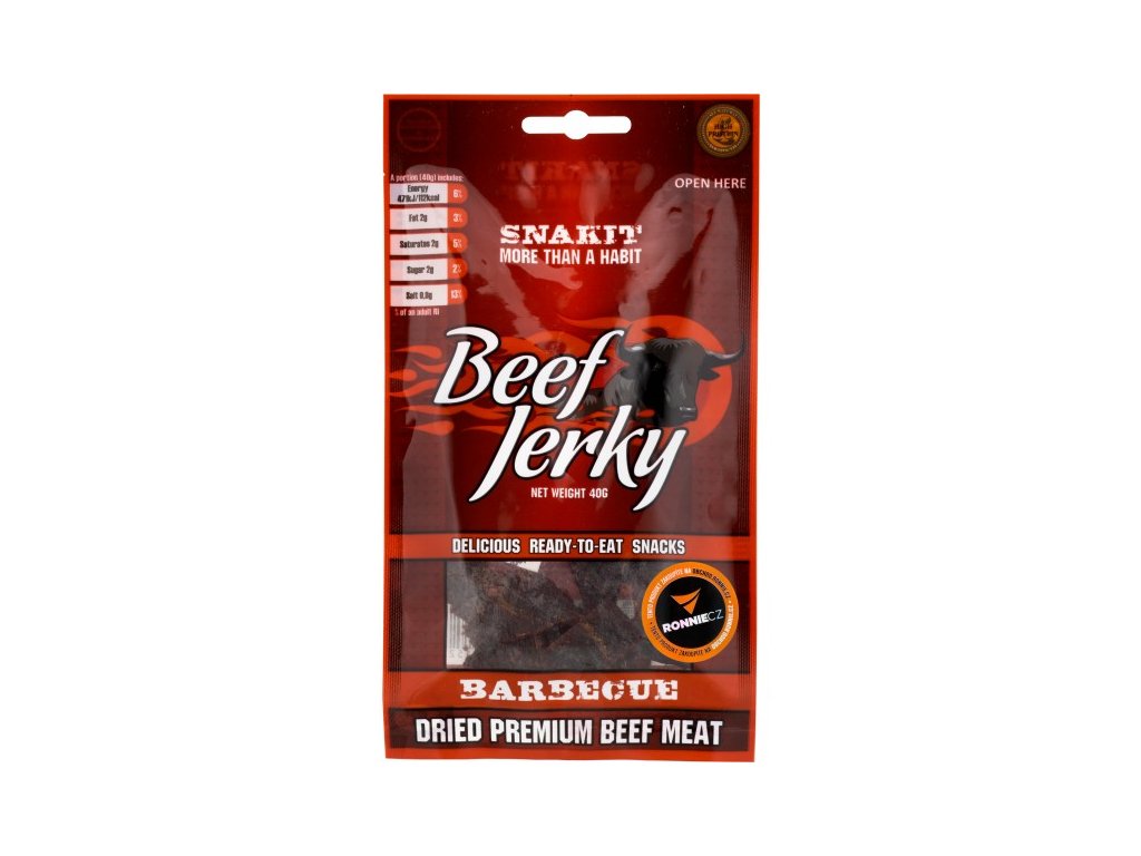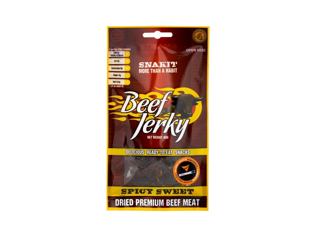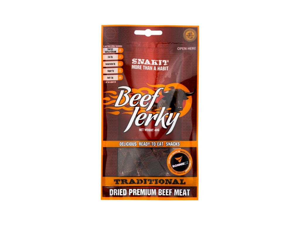 Pevné proužky prémiového hovězího sušeného masa od firmy Snakit. Svačina s vysokým obsahem bílkovin! Sušené a kořeněné. Lahodná, na proteiny bohatá a nízkotučná pochoutka z plátků prvotřídního hovězího masa. Snakit Jerky je nízkokalorické a je mnohem zdravější než například klasické chipsy. 100 g Jerky představuje 243 - 286 g čerstvého masa - takto ho můžete mít vždy u sebe a kdykoliv chcete!