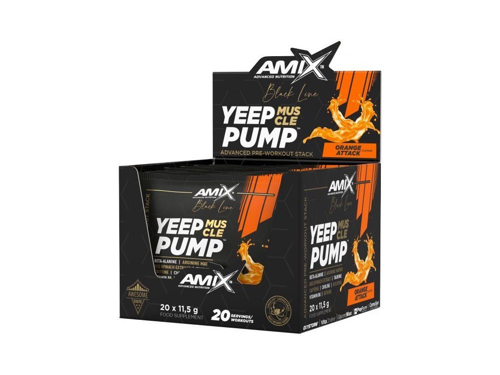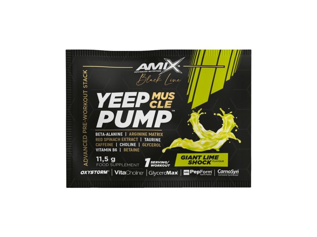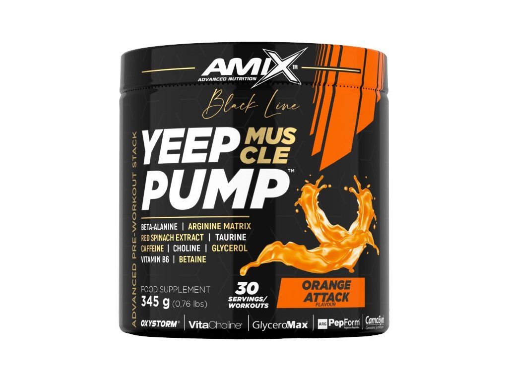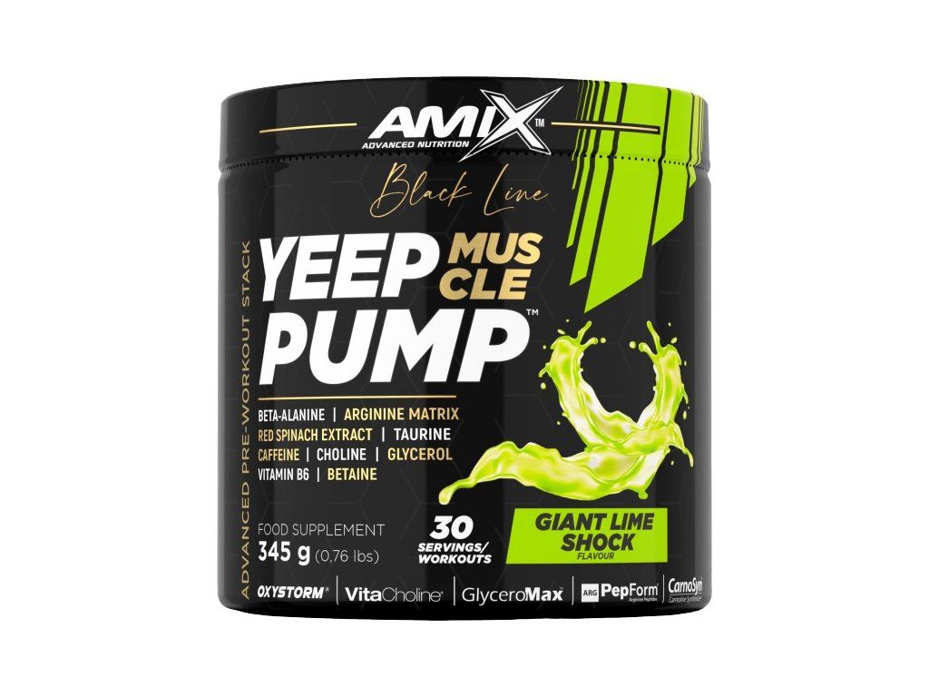 Yeep Pump z řady Black Line je revoluční superkoncentrovaný předtréninkový doplněk určený pro nejnáročnější sportovce, aby posunuli své intenzivní tréninky na další úroveň. Tento osvěžující a chutný nápoj je založen na dávce 3 g CarnoSyn® beta-alaninu a obohacen o argininový komplex, taurin, L-lysin, glycerin GlyceroMax™, VitaCholine®, extrakt z červeného špenátu Oxystorm®, betain, kofein a vitamín B6. Vitamín B6 pomáhá snižovat únavu a vyčerpání, zatímco kofein přispívá ke zvýšení odolnosti, pomáhá zlepšit koncentraci a bdělost.